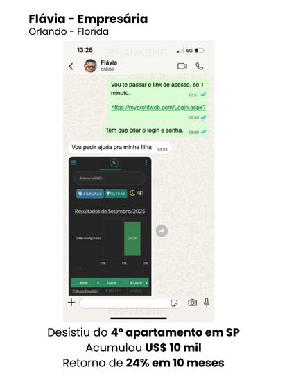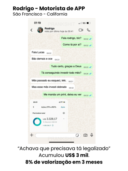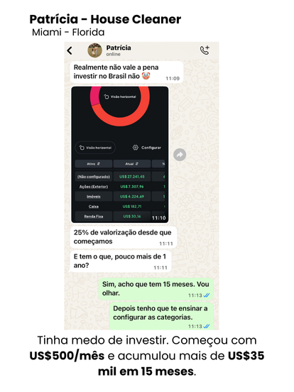 Brasileiros comuns, como você, já começaram com menos de US$500/mês e hoje veem seus investimentos crescerem mês após mês em dólar.